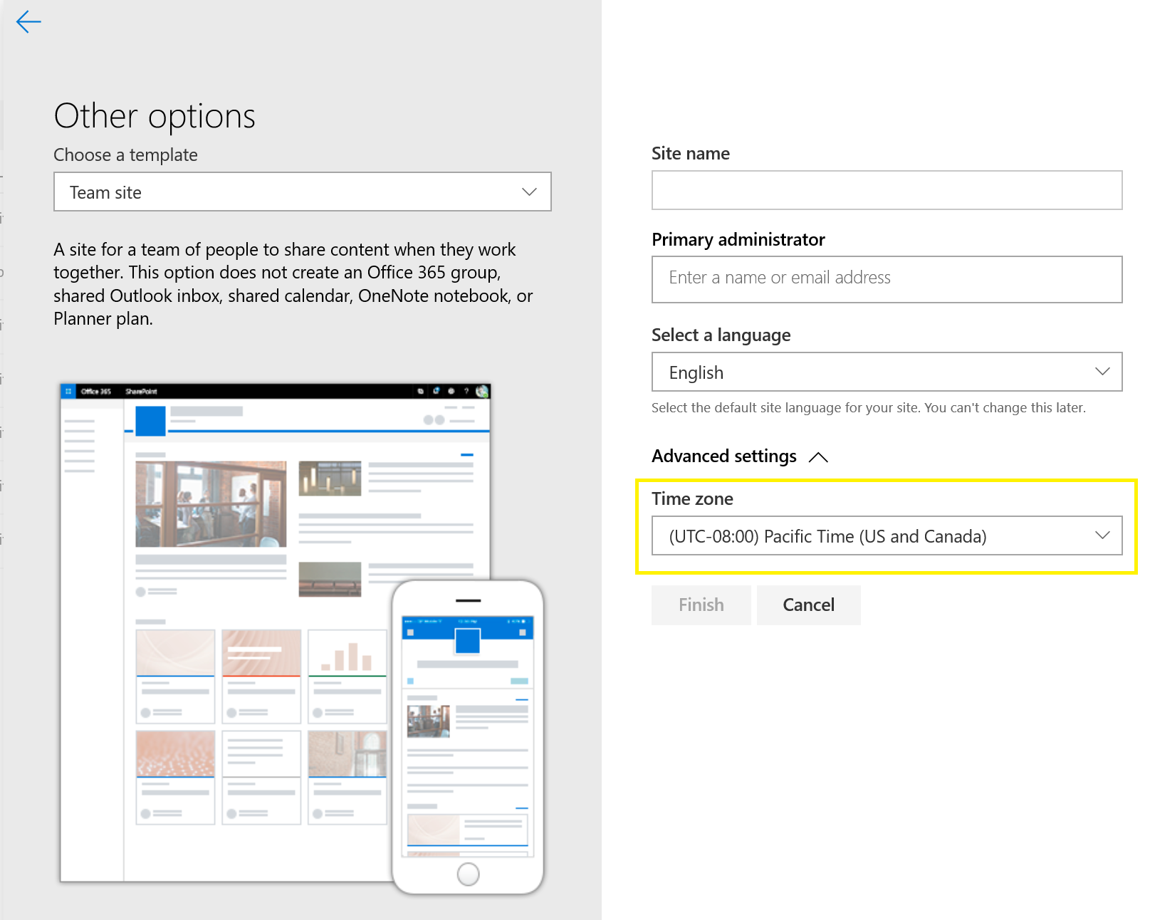 This blog post was prompted by recent activities in my O365 developer tenant. I noticed that I had not set the default time zone during site creation (see image below).