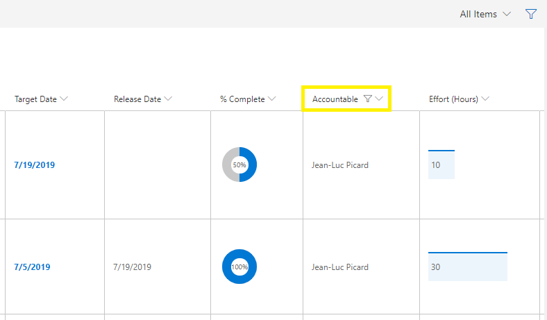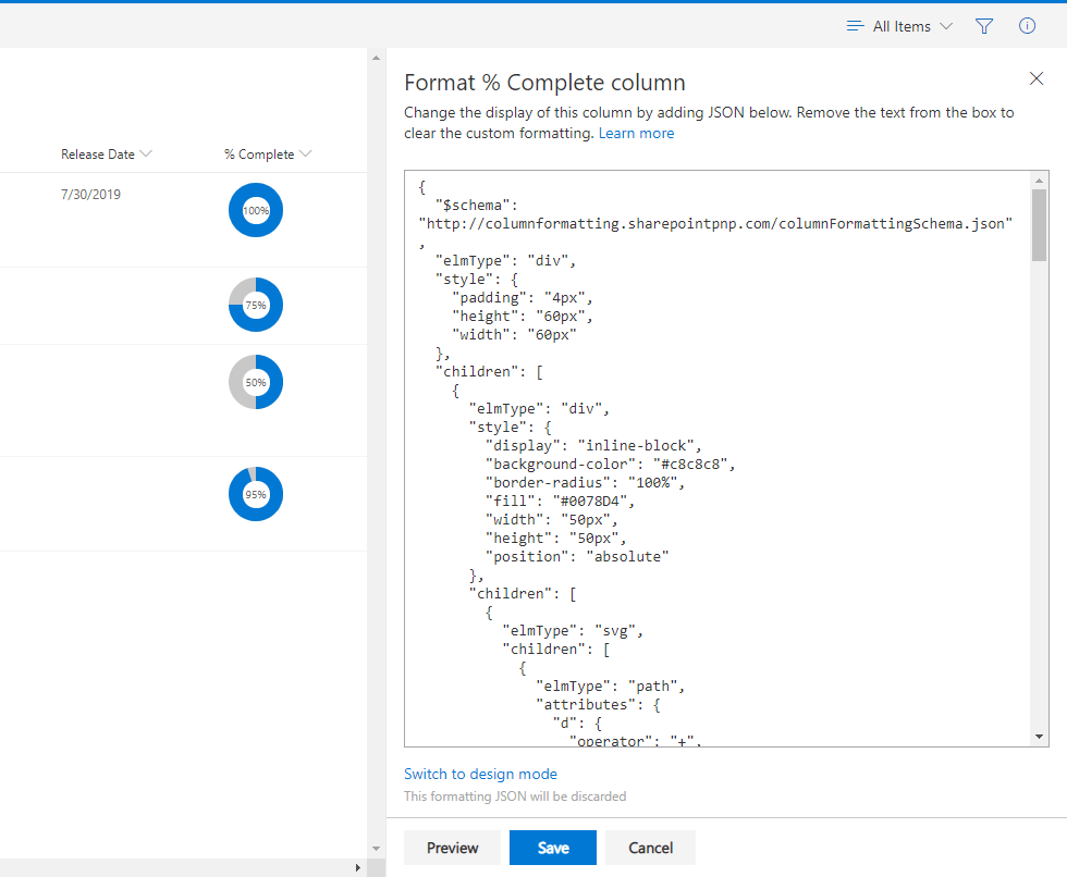 I’ll use JSON code to format the “% Complete” column to look like a donut chart.