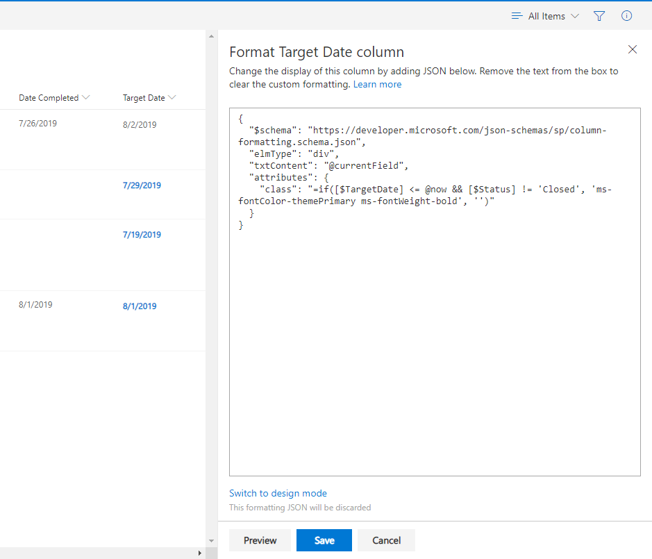 I’ll use more JSON code to highlight items that have missed their “Target Date”.