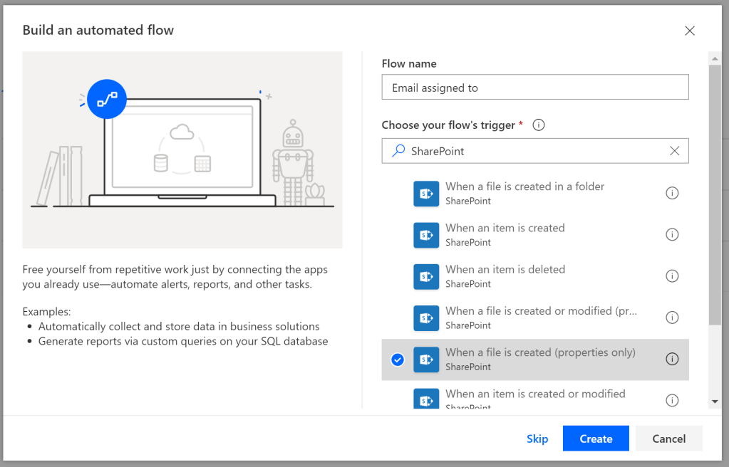 Provide a Flow name, i.e. “Email assigned to”, select the SharePoint “When a file is created (properties only)” trigger and click “Create”