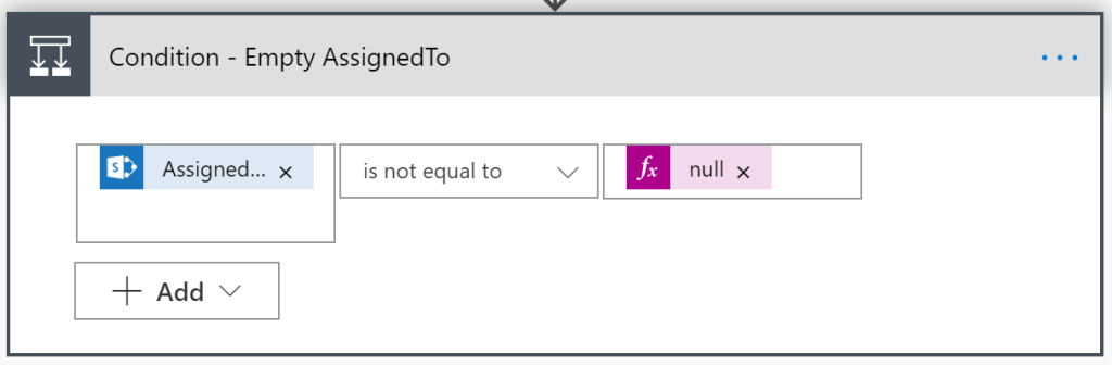 Add a “Condition” action and set “Value” to AssignedTo.DisplayName, condition is not equal to and choose a value to expression null