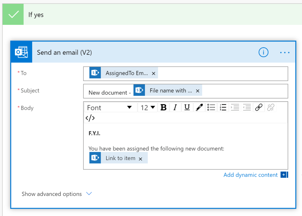 Set the “Yes” branch to the “Send an email (V2)” action with AssignedTo.Email in the “To” field