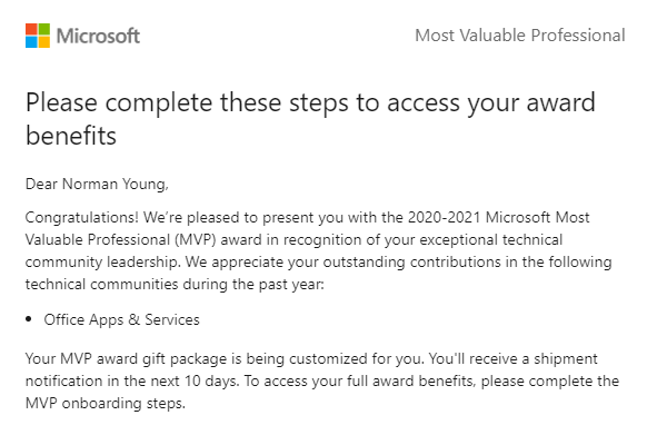 On February 1st, I received one of the best emails I have ever read. “Congratulations 2020-2021 Microsoft MVP!”. I’m totally blown away and am still shaking my head in disbelief. It’s such an honor to be in this group of awesome individuals. It’s cool seeing the many of the names of people that I follow on Twitter during MVP calls. I have a serious case of impostor syndrome and in no way think that I am in the same league as them. If you know me, you know that I can barely operate a push / pull door.