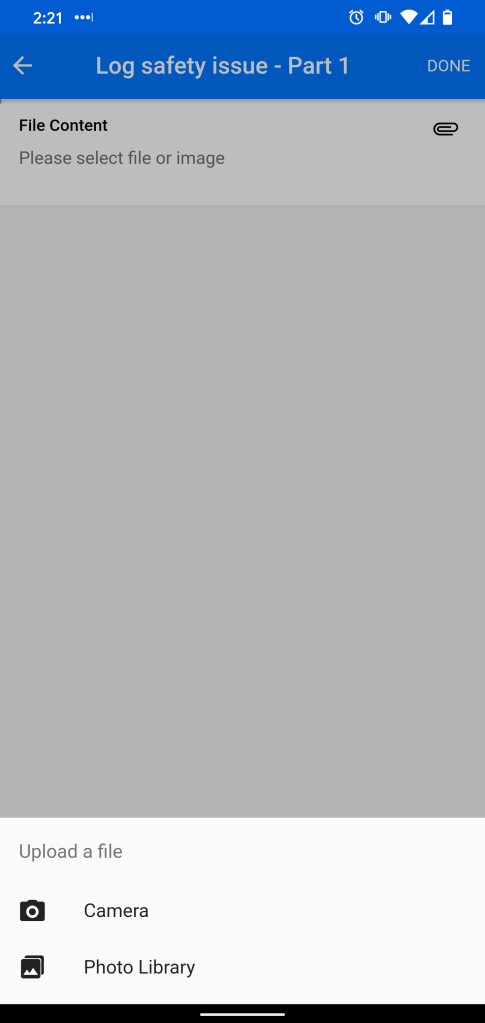 - Click “File Content” and then “Camera” to take a new photo or “Photo Library” to use an existing photo.