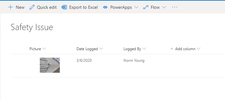 When the Flow is complete a new row is added to the “Safety Issue” list that displays a thumbnail of the safety issue, the date and who logged the issue. It’s not much but it will serve as the foundation for a larger solution.