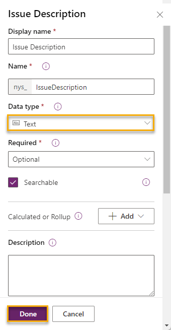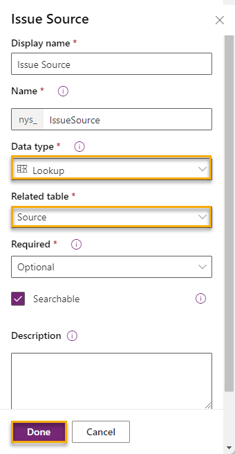 Create another table called Issue and set the Display name to “Issue” and select Enable attachments (including notes and files) and then click Save.